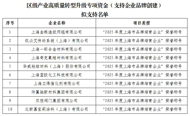 上海金山区关于产业高质量转型升级专项资金(支持企业品牌创建)拟支持名单的公示